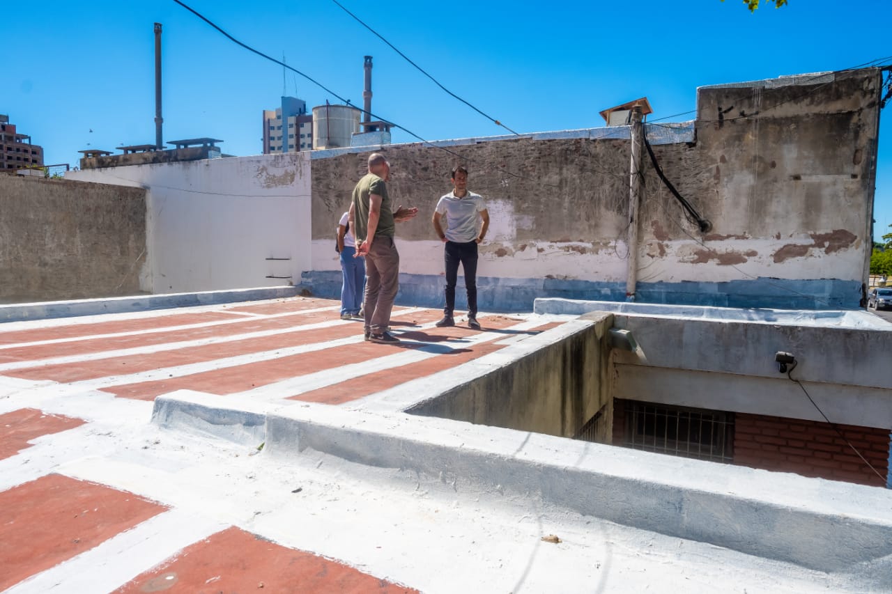 Primeramente, el arquitecto Fernando Perez Mernes, integrante del equipo de profesionales del Municipio, precisó que "las tareas que se desarrollan en este edificio tienen que ver con la impermeabilización de cubiertas. También se sellaron grietas, revoques y algunas tareas varias que fuimos encontrando en el relevamiento realizado. Se han ejecutado algunas gárgolas de desborde de libre escurrimiento que no había y que estaban obstruyendo el egreso de agua. En general, son tareas de impermeabilización, como te dije, tanto de cubiertas como en muros".