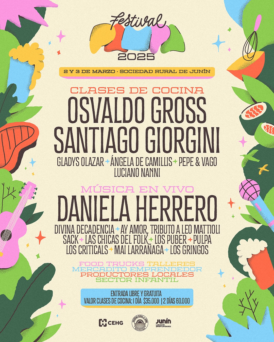 Yael Bonzanini, presidenta de la CEHG, explicó: “El Festival Pampa promueve la gastronomía juninense y la cultura general. En esta edición, contaremos con la presencia de Osvaldo Gross (pastelero), Santiago Giorgini (chef), Gladys Olazar (chef y pastelera), Ángela De Camillis (pastelera), Luciano Nanni (chef), Carmen y Karina Palioff (chefs) y Pepe y Vago (gastronómicos). Además, disfrutaremos de la música en vivo de Daniela Herrero y de las bandas locales ‘Los gringos’, ‘Divina decadencia’, ‘Ay amor’, ‘Pulpa’, ‘Sack’, ‘Los puber’, ‘Las chicas del Folk’, ‘Los criticals’ y ‘Mai Larrañaga’. Y también, de un tributo a Leo Mattioli”.