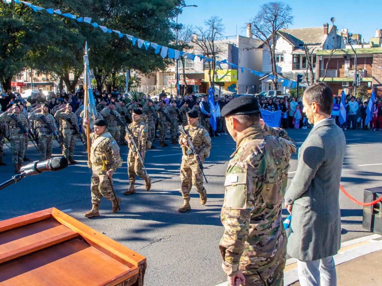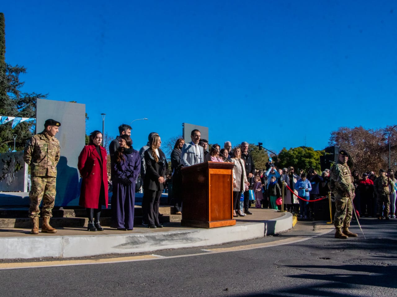 La jornada estuvo atravesada por un fuerte espíritu de identidad, pertenencia y emoción compartida, y contó con la participación de excombatientes de Malvinas, banderas de jardines maternales municipales, referentes eclesiásticos, miembros del Honorable Concejo Deliberante, colectividades, fomentistas, alumnos, docentes y medios de comunicación. En el inicio del acto, los soldados del Grupo de Artillería 10 realizaron el juramento de fidelidad a la bandera, mientras que el cierre estuvo a cargo de toda la comunidad presente, que, de manera unánime, reafirmó su promesa de defender, respetar y amar los colores nacionales con compromiso, responsabilidad y profundo sentido patriótico.