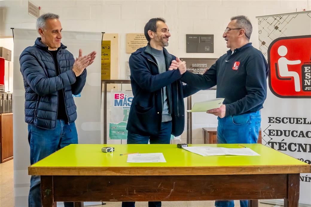 Participaron de rúbrica del nuevo acuerdo autoridades del Gobierno de Junín encabezadas por el intendente Pablo Petrecca, del Consejo Escolar, de la Inspección de Educación Técnica Profesional (ETP), como también de la propia EEST N°2 y de la Cooperadora de la institución.